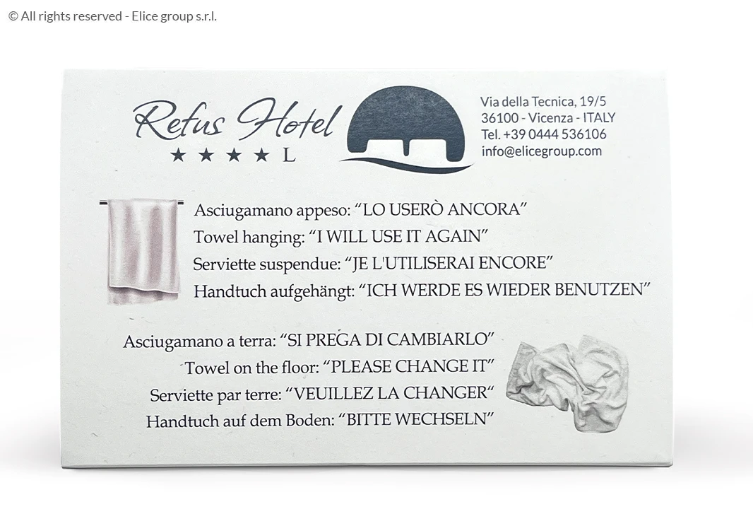 Il cartellino cambio asciugamani è la soluzione ideale per hotel e alberghi che desiderano offrire agli ospiti la possibilità di scegliere se richiedere la sostituzione degli asciugamani durante il soggiorno. Questo cartellino permette agli ospiti di comunicare facilmente al personale di pulizia le proprie preferenze, promuovendo una gestione più sostenibile delle risorse e un servizio personalizzato.