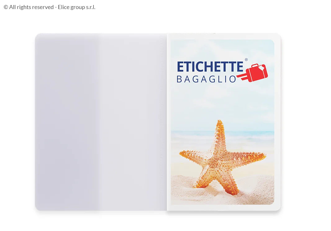 - Copertina porta passaporto in stampa digitale a colori realizzata unendo due strati di morbido PVC trasparente.