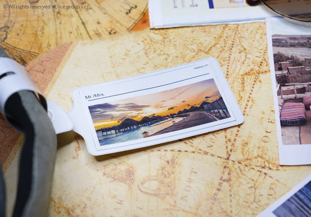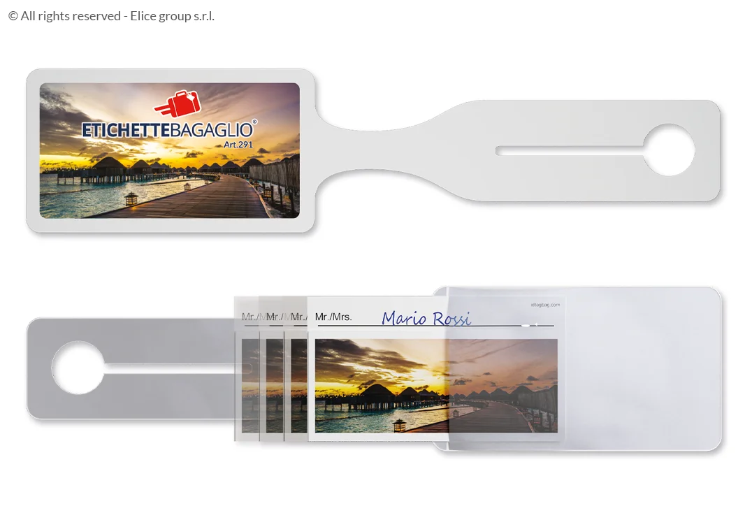 - L’etichetta bagaglio ha la tasca trasparente sul retro per inserire il cartoncino che tutela la tua privacy. Il cartoncino è perfetto per scrivere i dati identificativi del viaggiatore utilizzando una semplice penna a sfera.