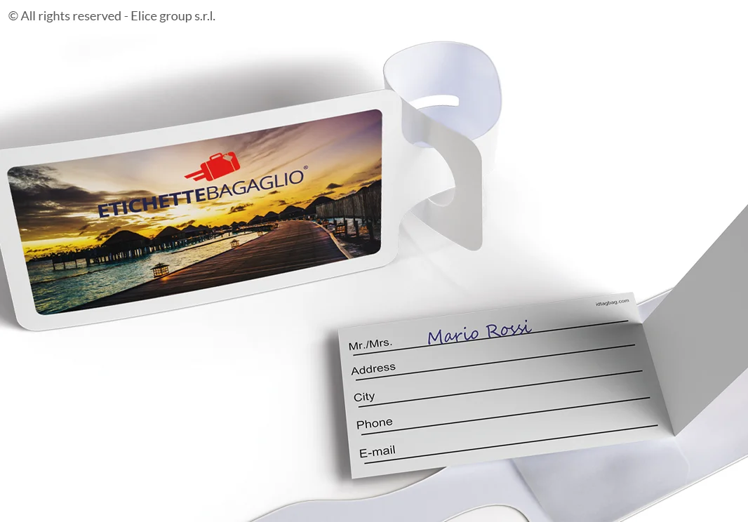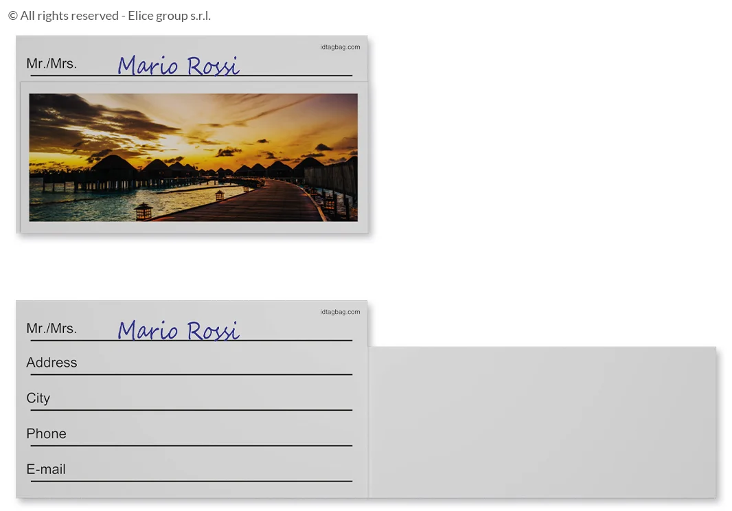 - Questo particolare cartoncino modello privacy, una volta inserito nell’apposita tasca trasparente dell’etichetta bagaglio, mostra esternamente solo il nome e il cognome del viaggiatore. Le altre informazioni di contatto sono conservate all’interno.