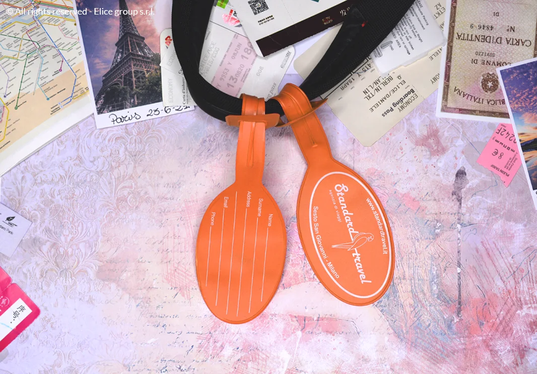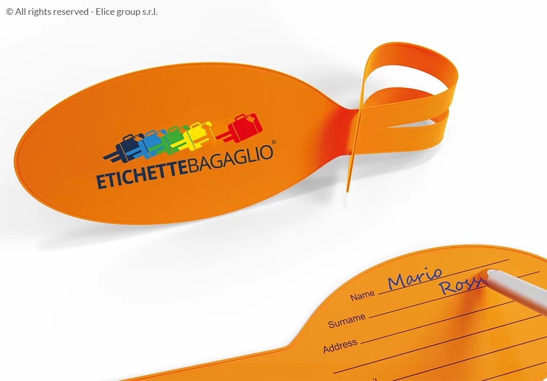 - Sul retro, ci sono gli spazi prestampati per inserire i dati del viaggiatore: nome, cognome, indirizzo, telefono, e-mail. La superficie è scrivibile utilizzando una comune penna a sfera. Il retro dell’etichetta bagaglio ha i dati del viaggiatore in inglese, in caso di modifiche o personalizzazioni è previsto un piccolo contributo del 6% per l’impianto di stampa e per la stampa ad un colore.