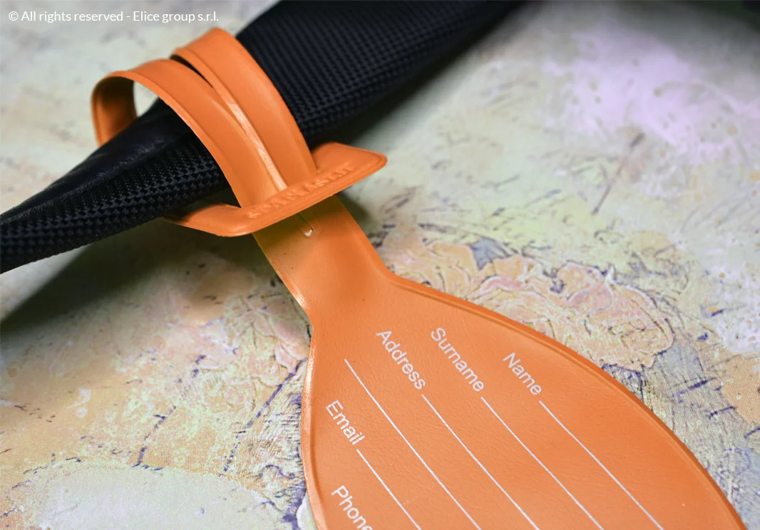 - L’etichetta ha la chiusura a coda di rondine studiata appositamente per fissarla alla valigia in modo veloce e rapido. Infatti, una volta agganciata l’etichetta alla maniglia del proprio bagaglio basta inserire nella fessura della coda la parte ovale e tirare verso l’esterno l’etichetta, assicurandola così al proprio bagaglio in modo sicuro e duraturo.