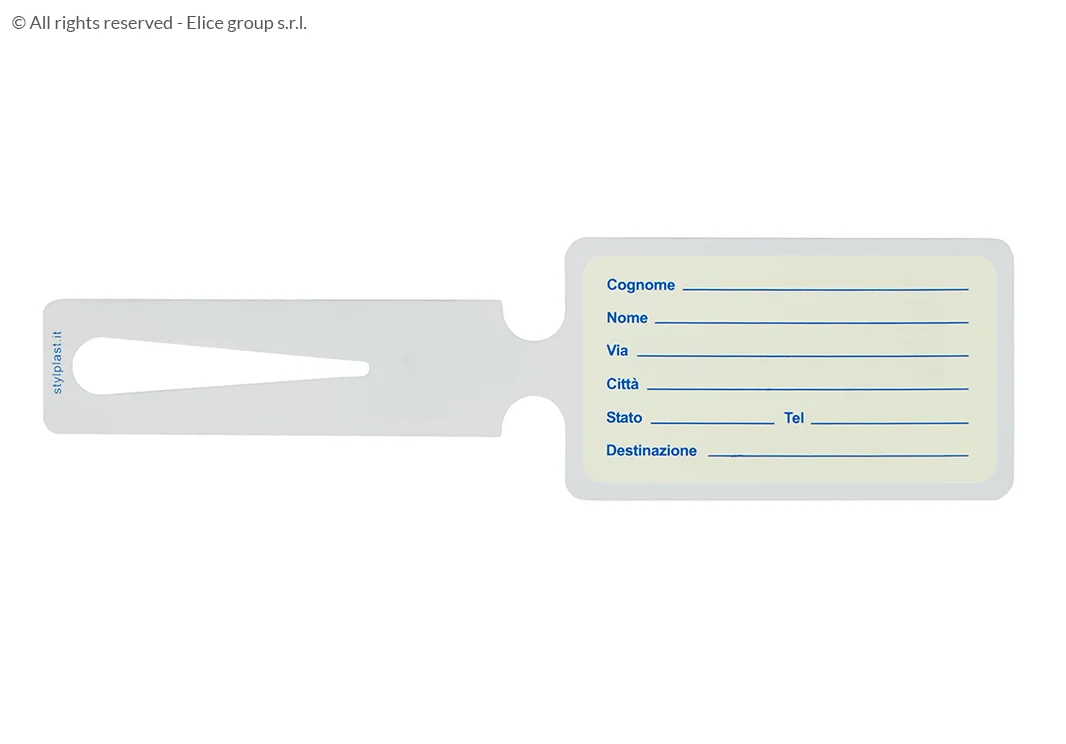L’etichetta ha una linea compatta e rettangolare ed è realizzata in plastica semirigida riciclabile. L’etichetta ha lo spazio sul retro per scrivere i dati personali del viaggiatore utilizzando una comune penna a sfera. La parte davanti dell’etichetta può essere invece interamente personalizzata con stampa in digitale e a colori per avere un prodotto unico e utile.