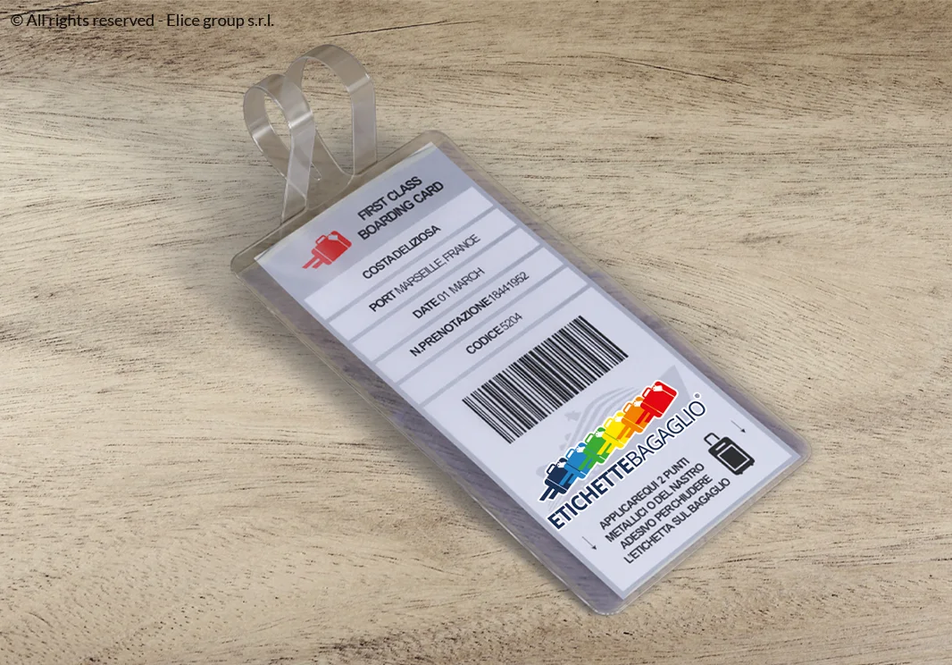 Etichetta per crociera completamente trasparente con stampa digitale a colori UV su un lato. Realizzata con due strati di robusto PVC completamente trasparente con una tasca per inserire la carta di imbarco.