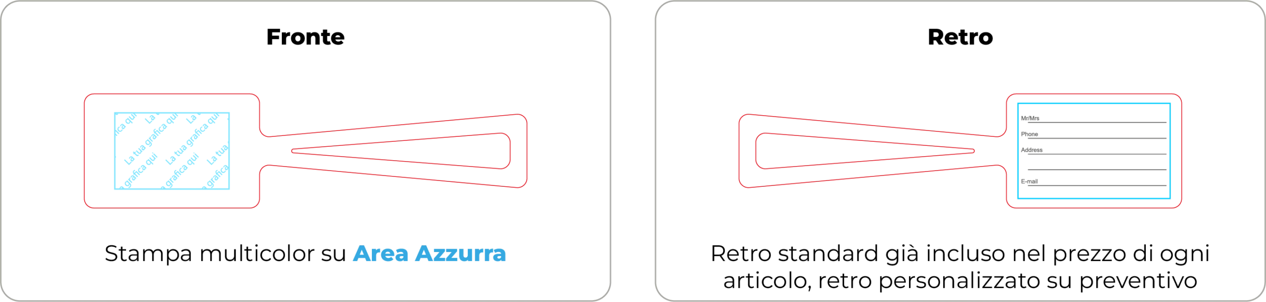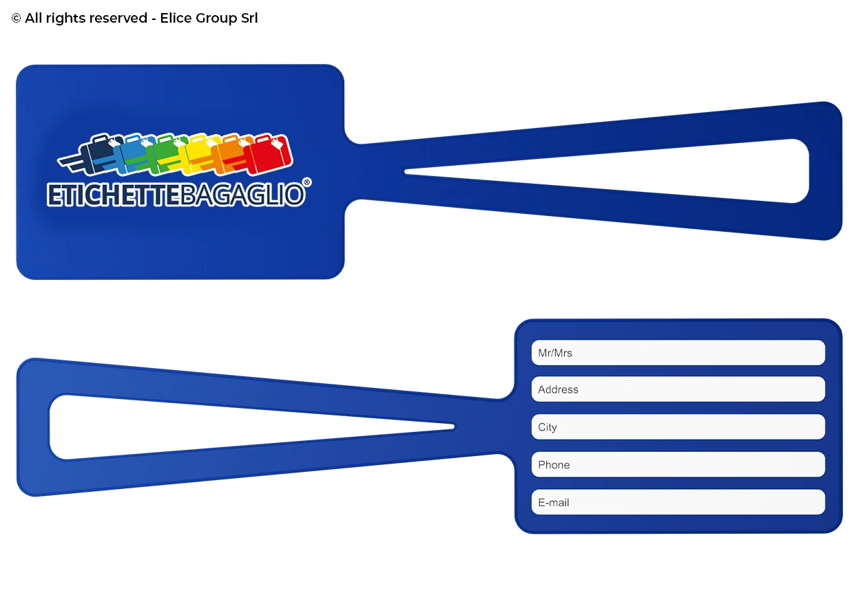 Sul retro, è possibile scrivere con una comune penna a sfera i dati del viaggiatore: nome, cognome, indirizzo, telefono; negli spazi prestampati. Il retro dell’etichetta bagaglio ha i dati del viaggiatore in inglese, in caso di modifiche o personalizzazioni è previsto un piccolo contributo del 6% per l’impianto di stampa e per la stampa ad un colore.