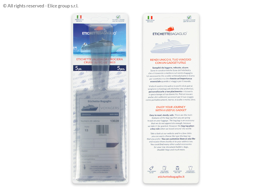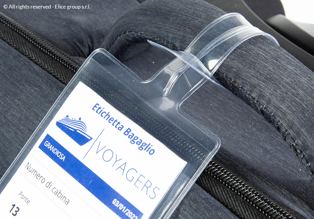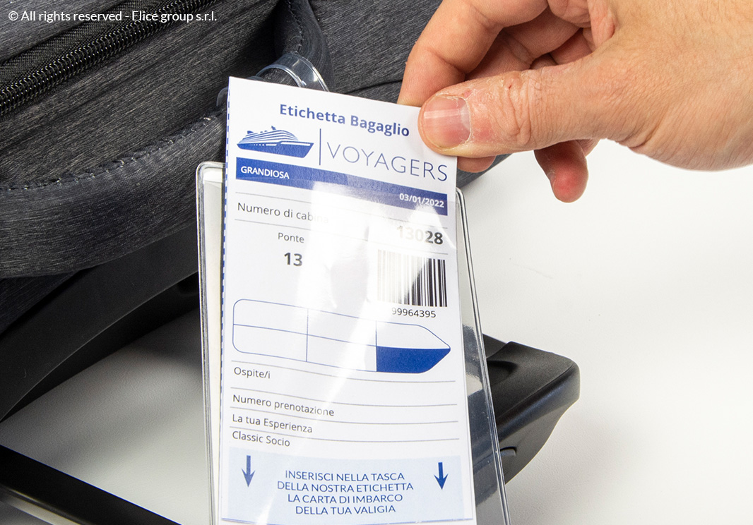 - L’etichetta bagaglio è dotata di una tasca principale pensata appositamente per inserire la carta d’imbarco. Qui sono indicate diverse informazioni come: il numero di cabina, il nome e cognome del viaggatore, il numero di prenotazione.