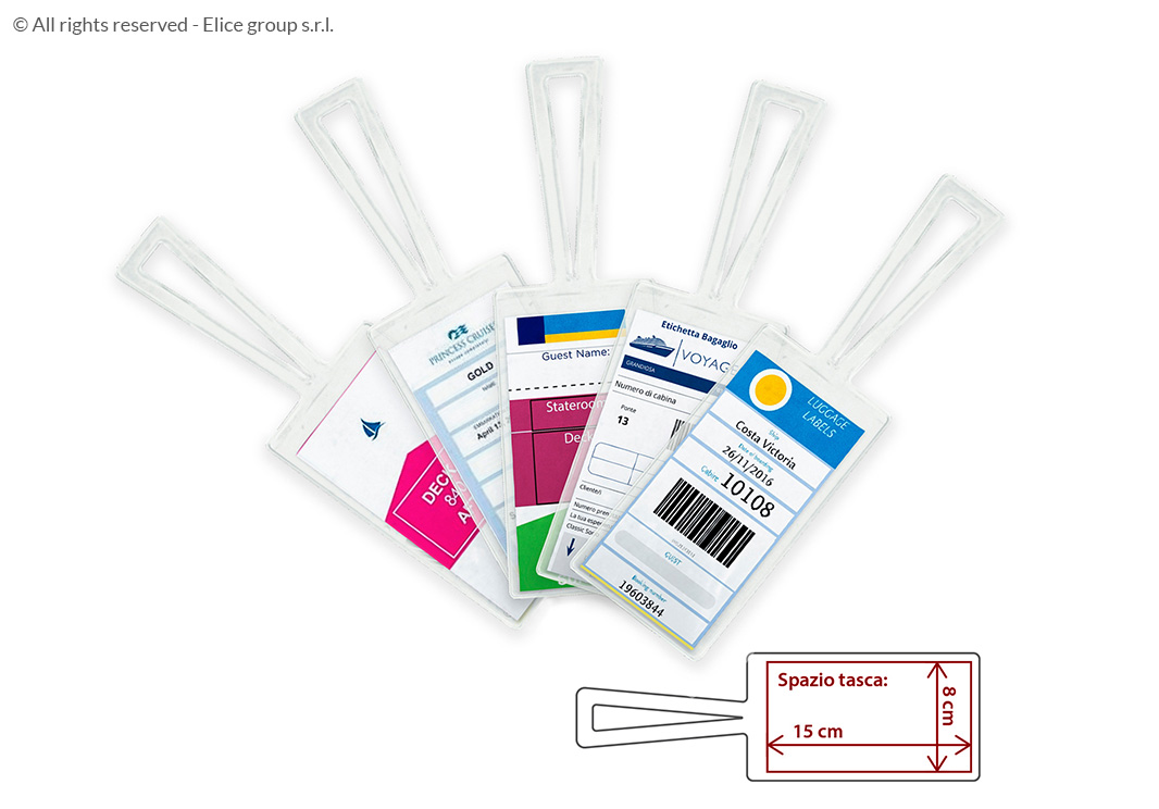 - L’etichetta bagaglio per crociera completamente trasparente è al quanto capiente. Le sue dimensioni sono di 28 x 8,5 cm e la tasca invece è di 16 x 8,5 cm.