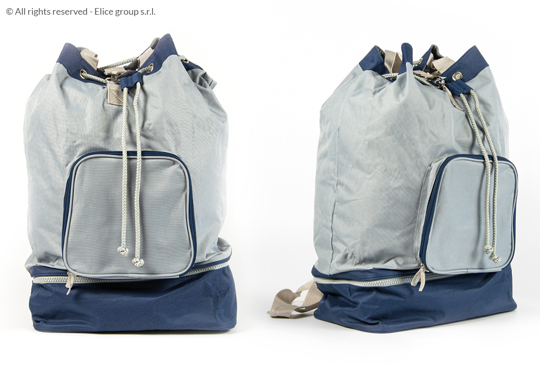 La sacca molto resistente e capiente ha tre tasche: una principale molto ampia, di circa 45 cm e profonda 40 cm, con chiusura a strozzo con cordoncino in tessuto intrecciato di colore blu e moschettone in metallo, un vano predisposto per le scarpe, chiudibile con robusta cerniera a zip a doppio cursore mentre nel fronte presenta una piccola tasca con chiusura a zip perfetta per oggetti piccoli come chiavi, telefono ecc…