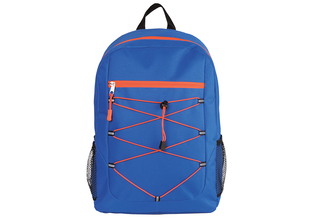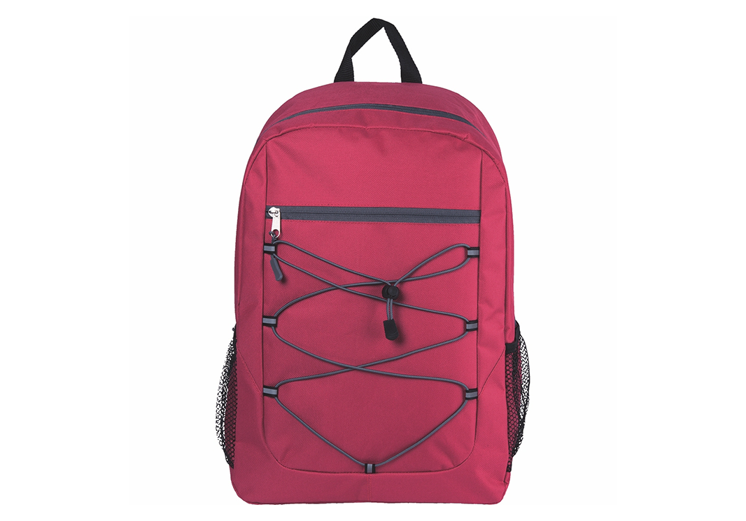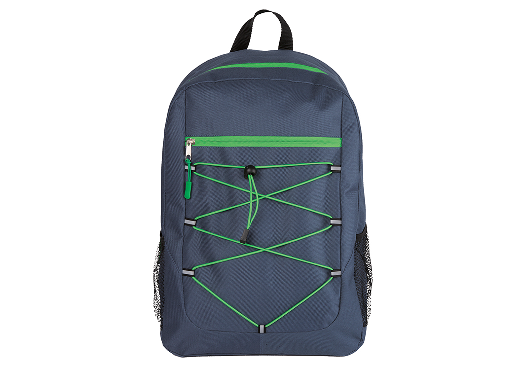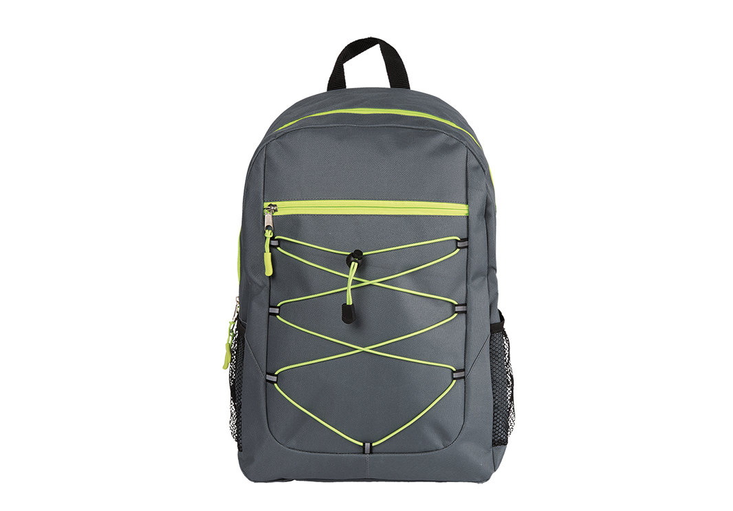 Questo zaino ha una tasca frontale con chiusura a zip e due tasche a rete laterali portabottiglie più un taschino sul retro